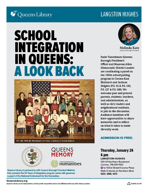Hello all, This coming Thursday, Jan. 26, Queens Memory and the Queens Borough President's Office will co-host a panel discussion on the historic school pairing programs at P.S. 92 and P.S. 149 in Jackson Heights and P.S. 127 and P.S. 148 in Corona/East Elmhurst in the 1960s. The panel will be led by Susie Tanenbaum, director of immigrant and inter-cultural affairs at the Queens Borough President's Office, and Democratic District Leader Maureen Allen. Panelists will include parents and students who experienced these programs. The event will be held at the Langston Hughes Library in Corona from 6 to 8 pm; light refreshments will be served. See flyer attached for more details -- hope to see you there! Lori Lori Wallach Queens Memory Outreach Coordinator queensmemory.org Center for Teaching and Learning, Razran 316 Queens College Lori.Wallach@qc.cuny.edu (718) 990-8532