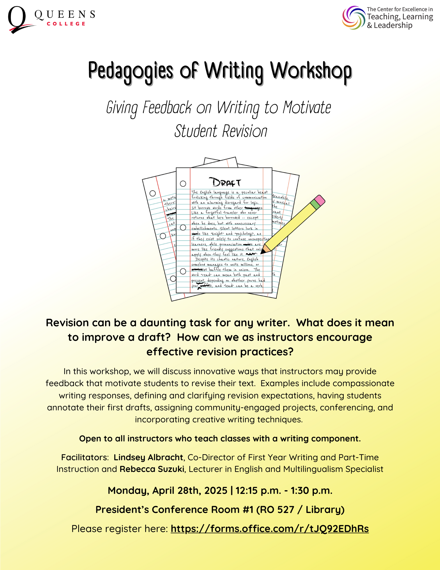 Pedagogies of Writing: Giving Feedback on Writing to Motivate Student Revision <https://www.qc.cuny.edu/cetll/pedagogies-of-writing/> Revision can be a daunting task for any writer. What does it mean to improve a draft? How can we as instructors encourage effective revision practices? In this workshop, Lindsey Albracht, Co-Director of First Year Writing and Part-Time Instruction and Rebecca Suzuki, Lecturer in English and Multilingualism Specialist, will discuss innovative ways that instructors may provide feedback that motivate students to revise their text. Examples include compassionate writing responses, defining and clarifying revision expectations, having students annotate their first drafts, assigning community-engaged projects, conferencing, and incorporating creative writing techniques. Open to all instructors who teach classes with a writing component. The workshop will be held on Monday, April 28th, 2025 from 12:15 p.m. - 1:30 p.m. in the President’s Conference Room #1 (RO 527/Library). Please register here: forms.office.com/r/tJQ92EDhRs<https://forms.office.com/r/tJQ92EDhRs> Contact CETLL with any questions: ctlonline@qc.cuny.edu<mailto:ctlonline@qc.cuny.edu> [cid:image001.png@01DBA936.3DE55750]