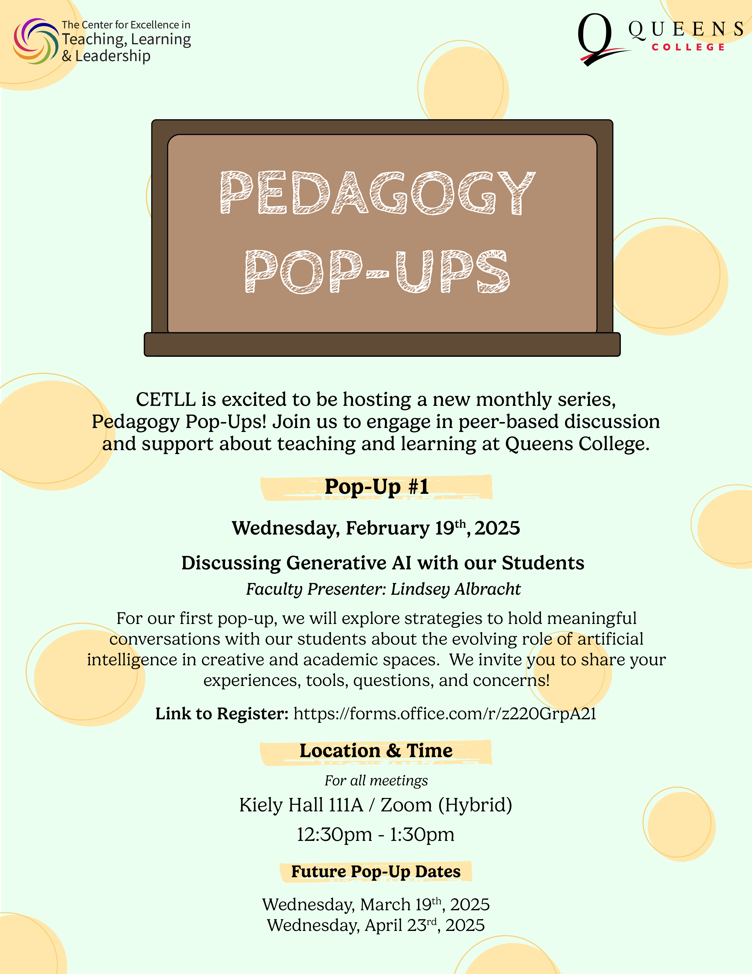 CETLL is excited to announce a new monthly event: Pedagogy Pop-Ups, a space for peer-based discussion and support about teaching and learning at Queens College. Join us for our first (hybrid) pop-up: Discussing Generative AI With Our Students, with Faculty Presenters Lindsey Albracht (English) and S. E. Hackney (GSLIS). We will explore strategies to hold meaningful conversations with our students about the evolving role of artificial intelligence in creative and academic spaces. We invite you to share your experiences, tools, questions, and concerns! We will meet on Wednesday, 2/19 from 12:30-1:30p in Kiely 111A/Zoom. We encourage you to bring your own lunch! Register here<https://urldefense.com/v3/__https://forms.office.com/pages/responsepage.aspx?id=s_BgbwZfCU6XFZiduozH2JapdVG3KD1Ok-x6_u-71xFUOU9SMTRFUzNERkNSU0tSUzM5QjMyQlhIRy4u&route=shorturl__;!!E8lrGBvW!smO7k4BiRoLoSx50qk0XAZQfhidPuMgJ9L1tfJ-EGZMeF6CmnrBdbAaLaQysuhXpkn8R7l9yAVOzEKG8PYLCeNq0nVb3jdEJVA$> Contact CETLL with any questions: ctlonline@qc.cuny.edu<mailto:ctlonline@qc.cuny.edu>