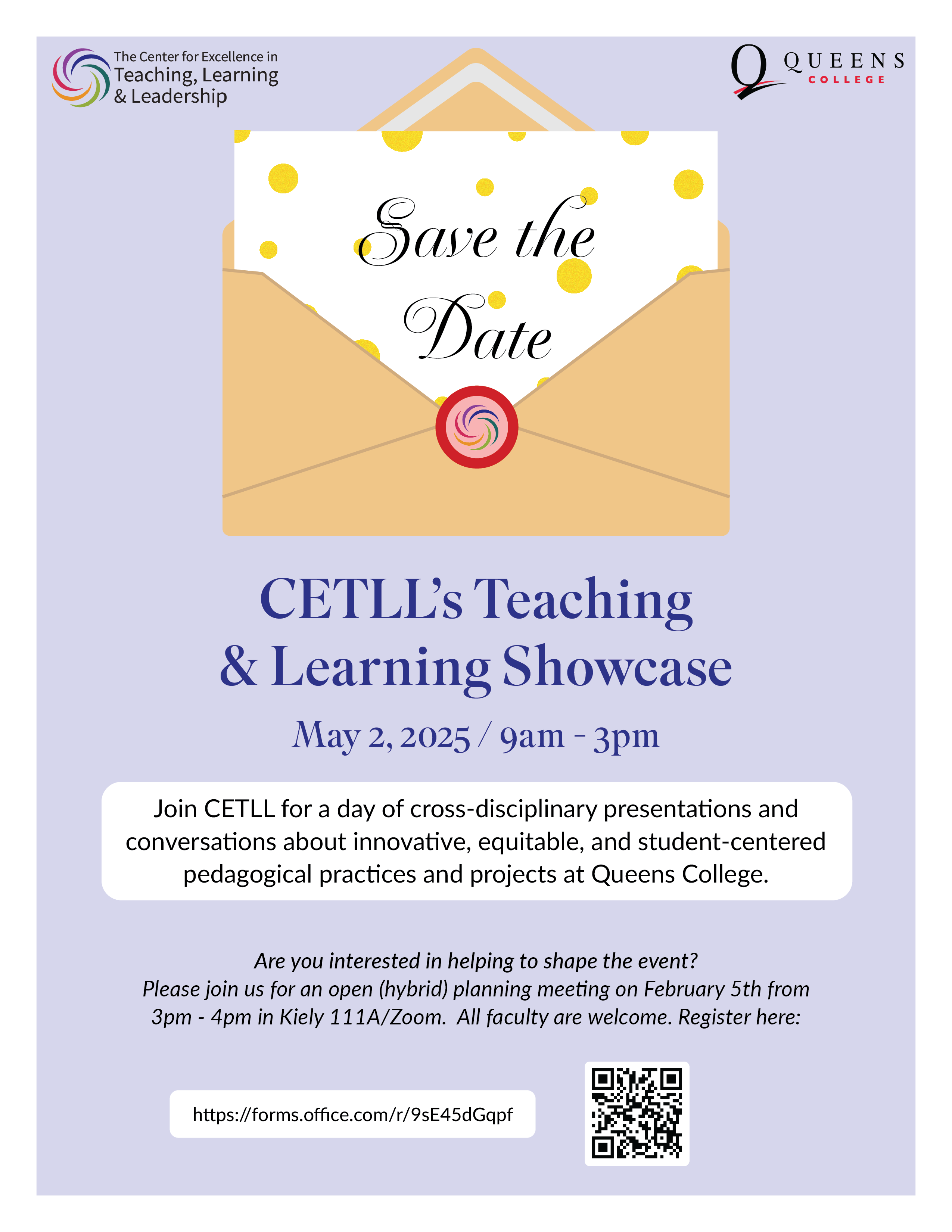 Greetings from the Center for Excellence in Teaching, Learning, and Leadership (CETLL)! Please save the date for CETLL's Teaching and Learning Showcase: Friday, May 2, 2025, from 9a-3p. This day-long event will include cross-disciplinary presentations and discussions about innovative, equitable, and student-centered pedagogical practices and projects at Queens College. Stay tuned for more details. Are you interested in helping to shape the event? Join an open planning meeting on February 5th, from 3:00-4:00p in Kiely 111A or on Zoom. You can register here<https://forms.office.com/r/9sE45dGqpf>. As a reminder, CETLL holds drop-in hours<https://www.qc.cuny.edu/cetll/cetll-its-drop-in-hours/> <https://www.qc.cuny.edu/cetll/cetll-its-drop-in-hours/> on Zoom<https://www.qc.cuny.edu/cetll/cetll-its-drop-in-hours/> twice a week for any and all questions related to Brightspace, instructional technology, and other matters related to teaching and learning. In Spring 2025, our drop in-hours are: Tuesdays 1:00-3:00p, Wednesdays 2:30-4:30p, And, by appointment-- email ctlonline@qc.cuny.edu<mailto:ctlonline@qc.cuny.edu> to set up a time. You can access drop-in hours through this Zoom link: https://bit.ly/QCxCETLL__Zoom