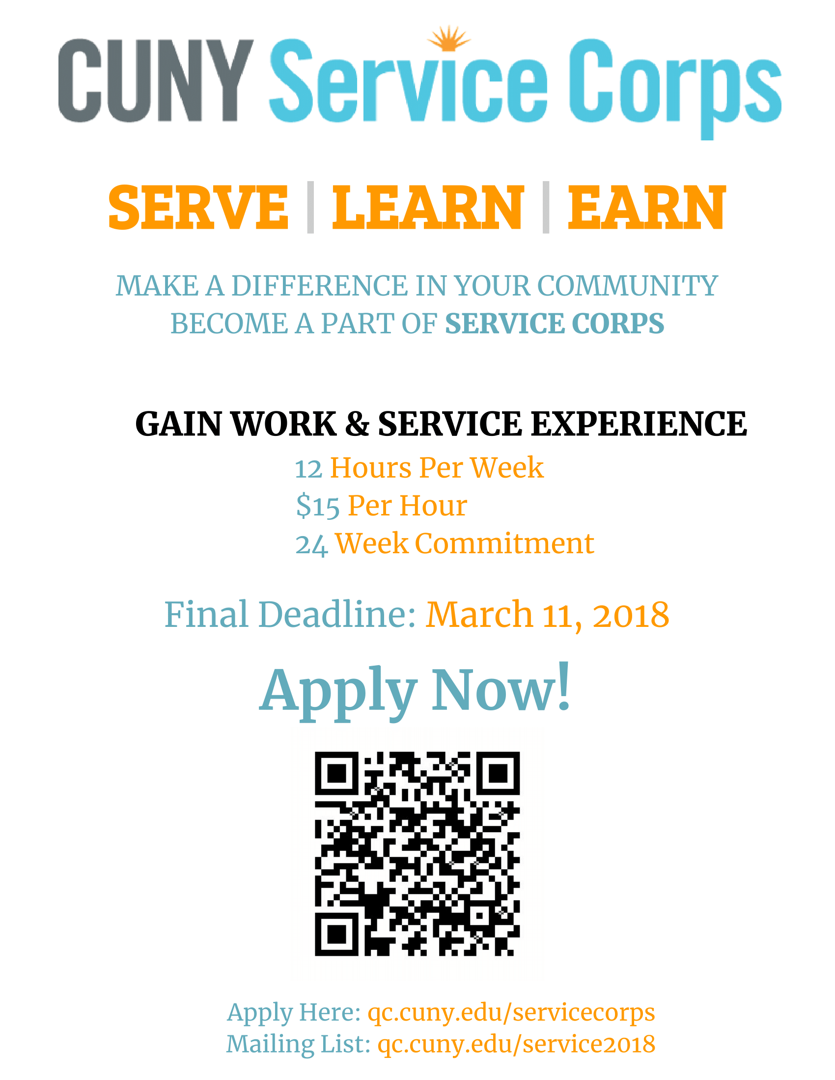Dear Faculty and Staff! I would like to ask for your help in inviting students to apply for CUNY Service Corps at Queens College. We are a talent pipeline program that recruits, selects and hires students to serve as ambassadors to CUNY, while also serving their community. With 100 community partners, our students get to work 12 hours per week, for 24 weeks at $15 per hour. We have a highly competitive admission criteria, and our students also receive 13 hours of pre-service training, plus monthly professional and personal workshop series. Our application criteria is based on a 2.5 and above GPA, full time class load, undergraduate or graduate, and with two full semesters left in college before graduation. Here is link to apply | Deadeline is March 11th | Flyer is attached www.qc.cuny.edu/servicecorps Please let us know if you have any questions, or would like to us to stop by your class to present the program to your students. Thank you for spreading this opportunity to your students. Cecilia Cecilia Britez<https://www.linkedin.com/in/cecilia-vega-britez-55530394> Campus Manager CUNY Service Corps at Queens College<http://qc.cuny.edu/servicecorps> 718-570-0548 | 314 Razran Hall