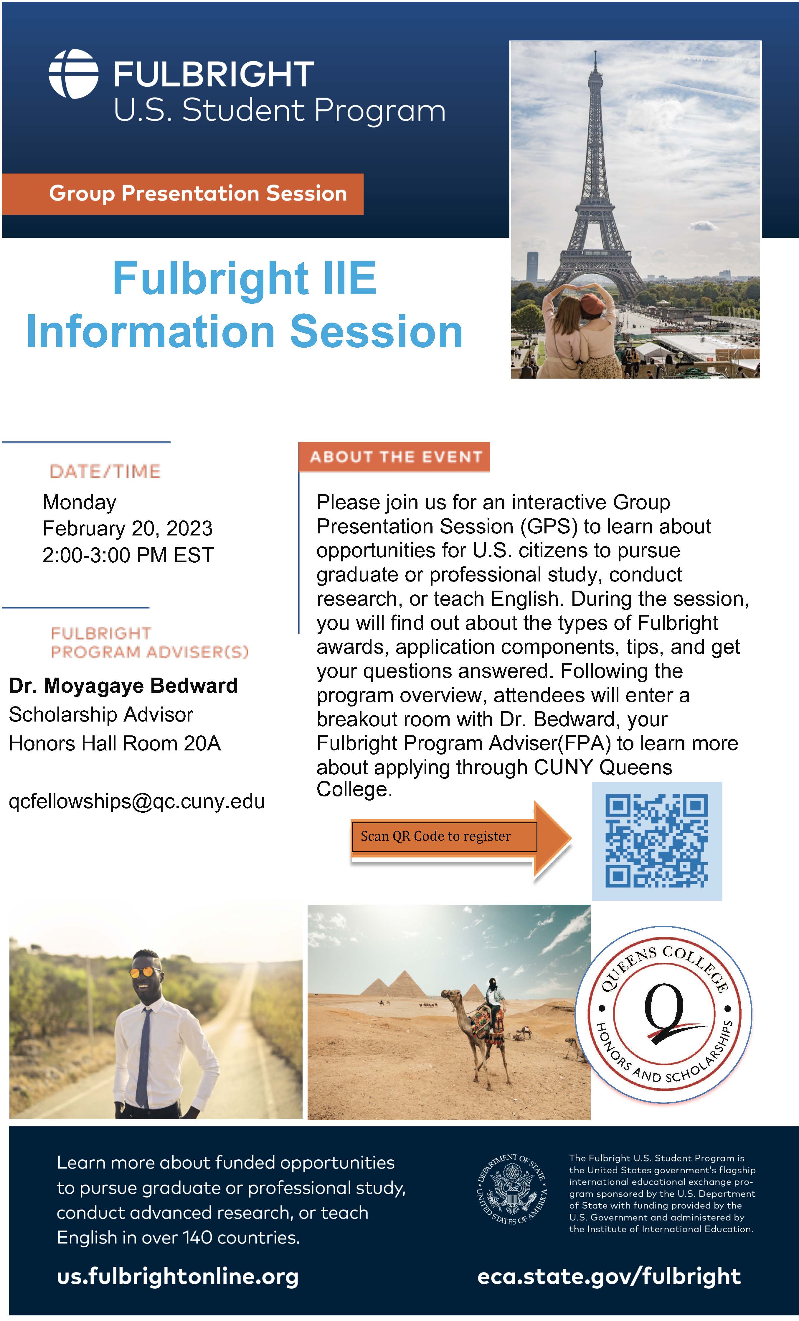 Dear Colleagues, Please see below the announcement for the Fulbright Scholarship program. Please kindly distribute it to your students. Thank you, Moya What is it? Fulbright Grants for Study and Research Abroad<https://urldefense.proofpoint.com/v2/url?u=https-3A__us.fulbrightonline.org_... > provide for one year of academic study or research in over 140 countries around the world. Projects may include university coursework, independent library, lab, or field research, classes in a music conservatory or art school, special projects in the social or life sciences, or a combination. Some countries support enrollment in graduate degree programs. Fulbright Grants for English Teaching Assistantships (ETA) provide funding and placements for one year in primary, and secondary schools or universities where grantees contribute to English-language instruction. ETA grants are offered in over 60 countries around the world. Recipients are expected to propose small research projects or community engagement activities beyond their teaching responsibilities. Who's eligible? * U.S. citizens * Juniors & Seniors * Those in good health Attend the info session on Monday, February 20th 2-3 pm EST. [cid:8a1d3b23-8c92-4b38-a2dc-b0055db98330] [cid:48ffedb4-dab6-4b5a-979c-d4d3341fa52c] Moyagaye Bedward Leverett, PhD Honors and Scholarships, Scholarship Specialist Office of the Provost QCfellowships@qc.cuny.edu Book an Appointment:https://urldefense.proofpoint.com/v2/url?u=https-3A__calendly.com_fellowship... Virtual Meetings: Dr. Moyagaye Bedward's Personal Meeting Room Join Zoom Meeting https://urldefense.proofpoint.com/v2/url?u=https-3A__us02web.zoom.us_j_89197... Meeting ID: 891 970 8545 <https://urldefense.proofpoint.com/v2/url?u=https-3A__calendly.com_fellowship... >