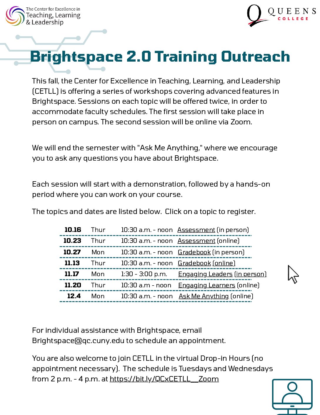 [cid:273dd92f-d9d5-459e-97a4-0f8c58b330b2] The Center for Excellence in Teaching, Learning, and Leadership (CETLL) continues our workshops on advanced features in Brightspace. Sessions on each topic will be offered twice, in order to accommodate faculty schedules. The first session will take place in person on campus. The second session will be online via Zoom. Each session will begin with a demonstration, followed by a hands-on period where you can apply what you learned to your Brightspace course. We will wrap up the semester with an Ask Me Anything session, where we invite you to bring any questions about Brightspace. Schedule of Training Sessions: Assessment 10.16 Thursday, 10:30am-noon (in person) Registration https://forms.office.com/r/7L5hPA0piB 10.23 Thursday, 10:30am-noon (online) Registration https://forms.office.com/r/iWrCtQZetu Gradebook 10.27 Monday, 10:30am-noon (in person) Registration https://forms.office.com/r/J4ihJwJG3g 11.13 Thursday, 10:30am-noon (online) Registration https://forms.office.com/r/zTrkf8RgWe Engaging Learners 11.17 Monday, 1:30pm-3:00pm (in person) Registration https://forms.office.com/r/jbxGwKimFU 11.20 Thursday, 10:30am-noon (online) Registration https://forms.office.com/r/Zd6G72R5bT Ask Me Anything 12.4 Monday, 10:30am-noon Registration https://forms.office.com/r/nR4yp9Z89m Ask any questions you have about Brightspace. For detailed information, please visit Brightspace 2.0 Training<https://www.qc.cuny.edu/cetll/brightspace-2.0/> Download the flyer<https://www.qc.cuny.edu/cetll/wp-content/uploads/sites/138/2025/10/Updated-Brightspace-2.0-Training-Outreach-0829-2.pdf>