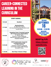 Join us for a Career-Connected Learning in the Curriculum event on Tuesday, September 16, 9:00 AM – 12:00 PM in the Muyskens Conference Room at The Summit. Learn more about: * How faculty can integrate career-connected learning into courses across all disciplines bridge, enhancing students’ post-graduation success and social mobility * The CUNY Faculty Career-Connected Learning Resource Hub, created by CUNY faculty, including QC Biology Assistant Professor Sebastian Alvarado; 2023-2024 CUNY Career Success Leadership Fellow Dr. Maria DeLongoria, QC Associate Provost for Academic and Faculty Affairs, will provide opening remarks, followed by two guest speakers: * Dr. Niesha Taylor, Director of Career Readiness, National Association of Colleges and Employers (NACE) * Dr. Robin Kietlinski, Professor of History, LaGuardia Community College; CUNY Office of Career and Industry Partnership (OCIP) Strategy Innovation Fellow We’ll close with a discussion of initiatives underway at QC, and how we can expand our efforts. Sponsored by the QC Center for Career Engagement & Internships; Center for Teaching, Learning & Leadership; and the Experiential Education office. RSVP by September 9th: https://tinyurl.com/QC-CCL. [cid:image001.png@01DC0B68.0F1D8750] -- Cristina Di Meo Experiential Education<https://www.qc.cuny.edu/academics/ee/> Director Queens College, CUNY 65-30 Kissena Blvd., Frese Hall 102 Flushing, NY 11367 718.570.0565 cristina.dimeo@qc.cuny.edu<mailto:cristina.dimeo@qc.cuny.edu> [signature_4172699724]