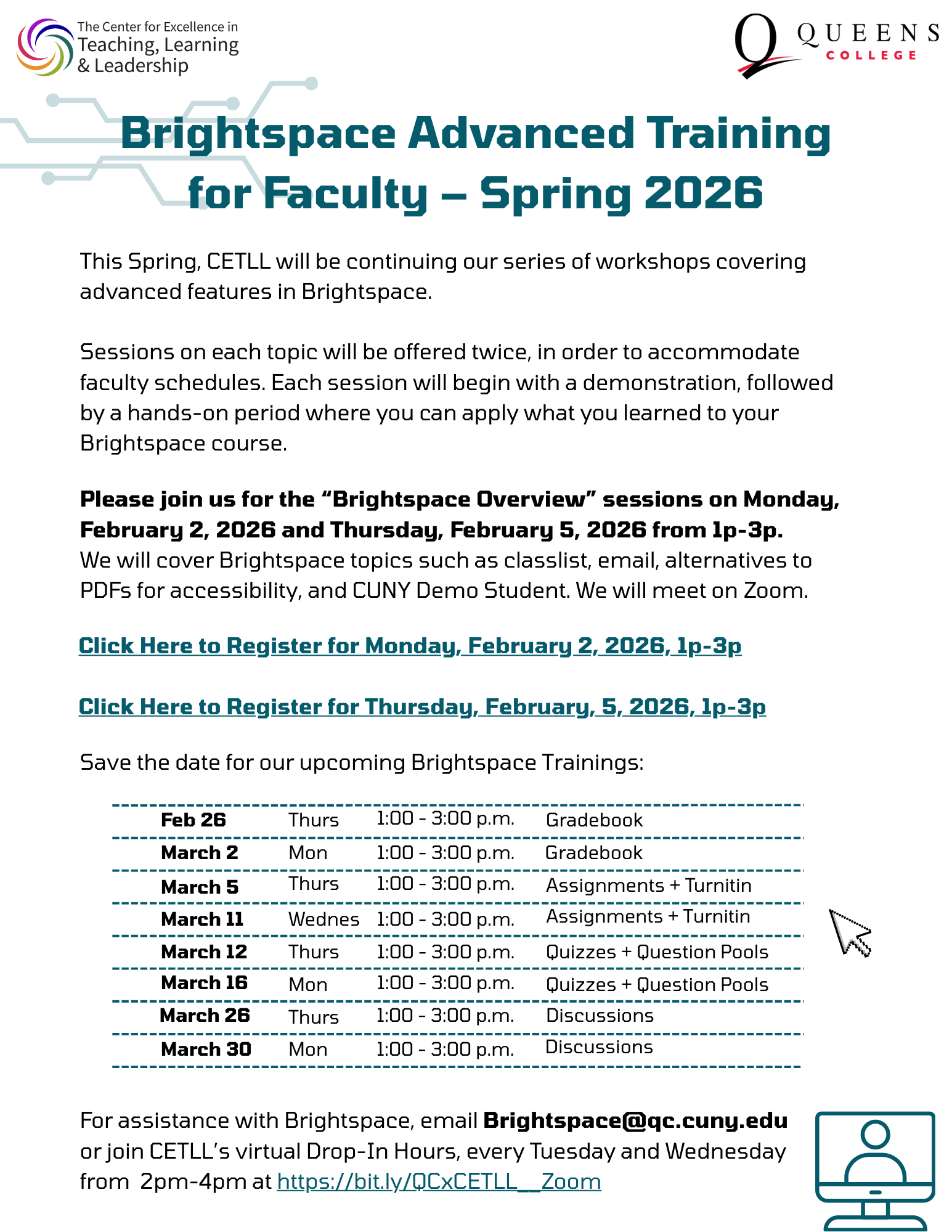 This Spring, CETLL will be continuing our series of workshops covering advanced features in Brightspace<https://www.qc.cuny.edu/cetll/brightspace-advanced-training-for-faculty/ >. Sessions on each topic will be offered twice, in order to accommodate faculty schedules. Each session will begin with a demonstration, followed by a hands-on period where you can apply what you learned to your Brightspace course. Please join us for the “Brightspace Overview” sessions on Monday, February 2, 2026, and Thursday, February 5, 2026, from 1p-3p. We will cover Brightspace topics such as classlist, email, alternatives to PDFs for accessibility, and CUNY Demo Student. We will meet on Zoom. Click Here to Register for Monday, February 2, 2026, 1p-3p<https://urldefense.com/v3/__https://forms.office.com/r/0Qx4e1XA28__;!!E8lrGB... > Click Here to Register for Thursday, February 5, 2026, 1p-3p<https://urldefense.com/v3/__https://forms.office.com/r/EKFgYRiD1L__;!!E8lrGB... > Save the date for our upcoming Brightspace Trainings: Gradebook: Feb 26, 1p-3p + March 2, 1p-3p Assignments + Turnitin: March 5, 1p-3p + March 11, 1p-3p Quizzes + Question Pools: March 12, 1p-3p + March 16, 1p-3p Discussions: March 26, 1p-3p + March 30, 1p-3p For assistance with Brightspace, email Brightspace@qc.cuny.edu<mailto:Brightspace@qc.cuny.edu> or join CETLL’s virtual Drop-In Hours, every Tuesday and Wednesday from 2pm-4pm at https://urldefense.com/v3/__https://bit.ly/QCxCETLL__Zoom__;!!E8lrGBvW!rfNU4... . [Brightspace 2.0 Training - Overview - Spring 2026.png]
