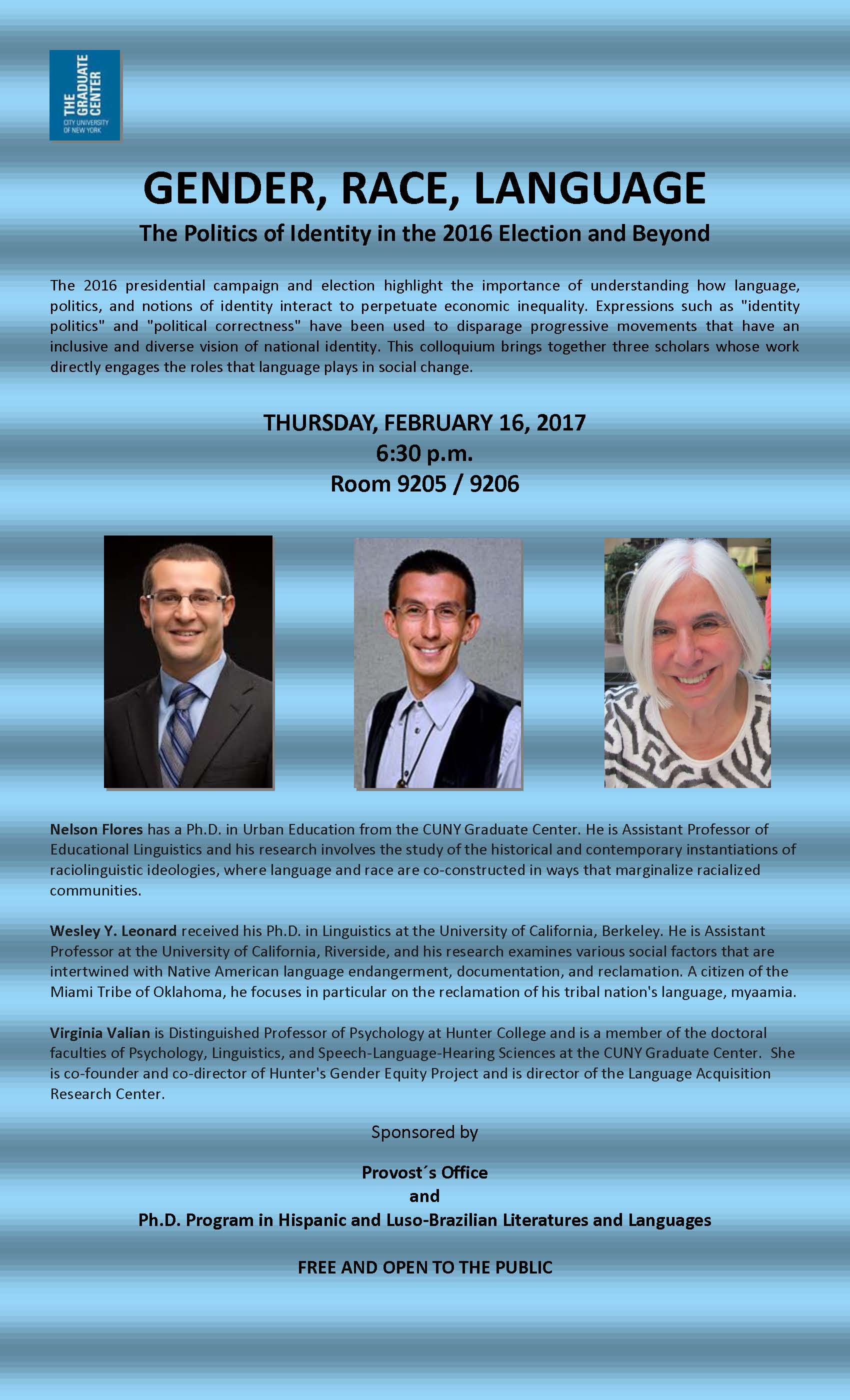 Greetings, colleagues: Some of you may be interested in the event advertised in the attachments, on gender, race, and language, organized by the Graduate Center's Office of the Provost and the PhD Program in Hispanic & Lus-Brazilian Literatures and Languages. The three speakers have backgrounds in educational linguistics, sociolinguistics, and psycholinguistics. Best wishes, Eva Eva M. Fernández Acting Assistant Provost Queens College, City University of New York http://efernandez.qwriting.qc.cuny.edu<http://efernandez.qwriting.qc.cuny.edu/> ------------------------------- Gender, Race, Language: Politics of Identity in the 2016 Election and Beyond Thursday, February 16, 2017, 6:30pm CUNY Graduate Center Room 9205/9206 [cid:image002.jpg@01D27C6D.29FCAB70]