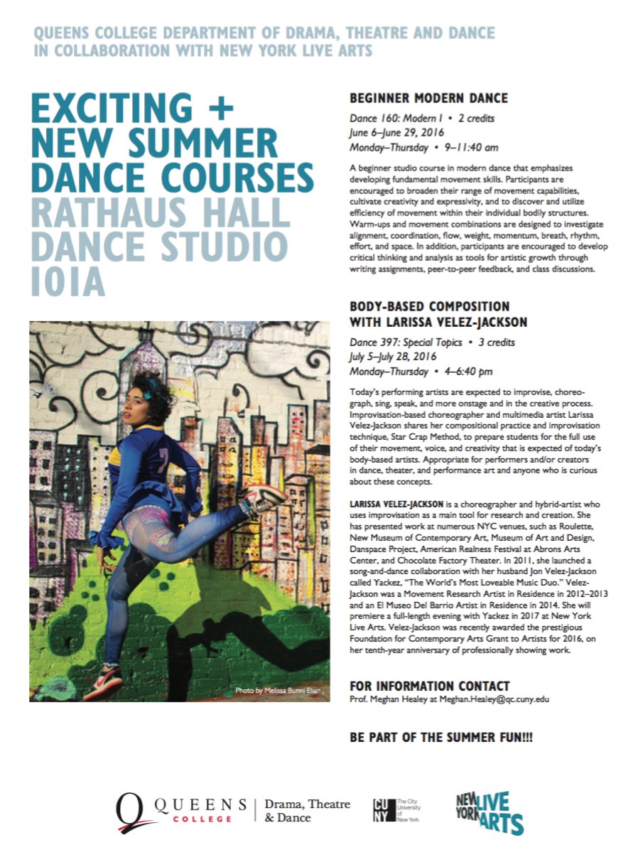 * Interested in learning more about choreography? * Curious about how the body and voice can inform movement? * Want to know more about the Star Crap Method? Then the Body-based Composition course with Larisa Velez-Jackson is perfect for you! Body-based Composition with Larissa Velez-Jackson Today's performing artists are expected to improvise, choreograph, sing, speak and more onstage and in the creative process. Improvisation-based choreographer and multimedia artist Larissa Velez-Jackson shares her compositional practice and improvisation technique, Star Crap Method, to prepare students for the full use of their movement, voice and creativity that is expected of today's body-based artists. Appropriate for performers and/or creators in dance, theater and performance art and students (or those) that are curious about these concepts. Dance 397: Special Topics, 3 credits July 5 - July 28, 2016 - Four Weeks Mon/Tue/Wed/Thur from 4pm - 6:40pm Rathaus Hall Dance Studio 101A Larissa Velez-Jackson is a choreographer and hybrid-artist who uses improvisation as a main tool for research and creation. She has presented work at numerous NYC venues such as: Roulette, New Museum of Contemporary Art, Museum of Art and Design, Danspace Project, American Realness Festival at Abrons Arts Center and Chocolate Factory Theater. In 2011, she launched a song-and-dance collaboration with her husband Jon Velez-Jackson called Yackez, "The Worlds Most Loveable Music Duo". Velez-Jackson was a Movement Research Artist in Residence '12-'13 and an El Museo Del Barrio Artist in Residence '14. She will premiere a full-length evening with Yackez in 2017 at New York Live Arts. Velez-Jackson was recently awarded the prestigious Foundation for Contemporary Arts Grant to Artists for 2016, on her tenth year anniversary of professionally showing work. Be part of the Summer Fun!!! SUMMER SESSION at QUEENS COLLEGE The Dept. Drama, Theatre and Dance in collaboration with New York Live Arts [cid:009ac10e-1a6e-42b1-8f26-db0c91d4d1d1]
