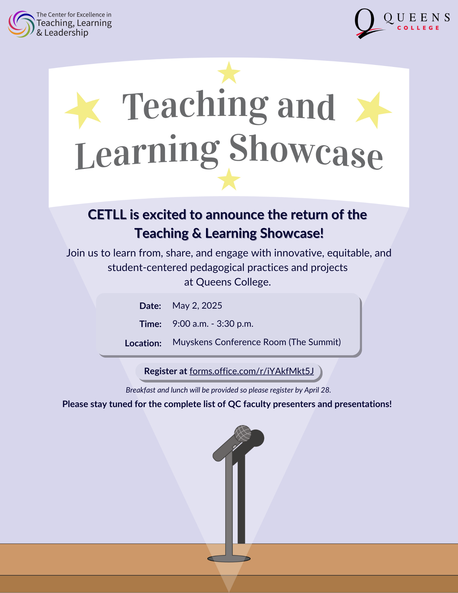 CETLL is excited to announce the return of the Teaching and Learning Showcase<https://www.qc.cuny.edu/cetll/teaching-and-learning-showcase/>! Join us to learn from, share, and engage with innovative, equitable, and student-centered pedagogical practices and projects at Queens College. Date: May 2, 2025 Time: 9:00 a.m.- 3:30 p.m. Location: Muyskens Conference Room (The Summit) Register at https://forms.office.com/r/iYAkfMkt5J Breakfast and lunch will be provided so please register by April 28. Please stay tuned for the complete list of QC faculty presenters and presentations! Contact CETLL with any questions: ctlonline@qc.cuny.edu<mailto:ctlonline@qc.cuny.edu> [cid:image001.png@01DBA87A.56644550]