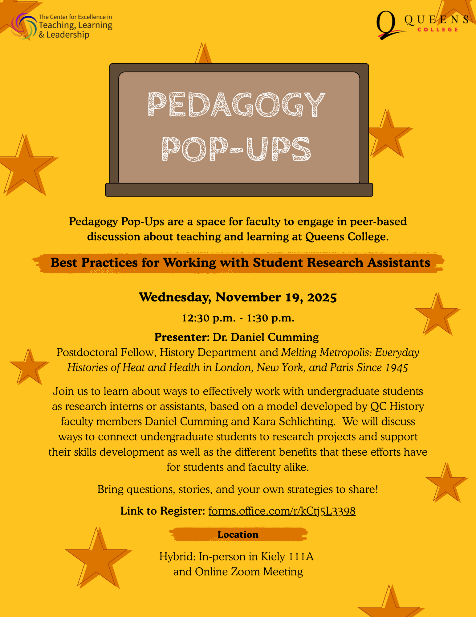 Please join us for our upcoming pop-up: Best Practices for Working with Student Research Assistants<https://www.qc.cuny.edu/cetll/pedagogy-pop-ups/> with faculty presenter Dr. Daniel Cumming (Postdoctoral Fellow, History Department and Melting Metropolis: Everyday Histories of Heat and Health in London, New York, and Paris Since 1945) Join us to learn about ways to effectively work with undergraduate students as research interns or assistants, based on a model developed by QC History faculty members, Daniel Cumming and Kara Schlichting. We will discuss ways to connect undergraduate students to our research projects and support their skills development as well as the different benefits that these efforts have for students and faculty alike. Bring questions, stories, and your own strategies to share! We will meet on Wednesday, 11/19/25 from 12:30-1:30p in Kiely 111A and on Zoom: Register Here<https://forms.office.com/r/kCtj5L3398> Please contact CTLOnline@qc.cuny.edu<mailto:CTLOnline@qc.cuny.edu> with any questions. [cid:image001.png@01DC4370.539E1760]