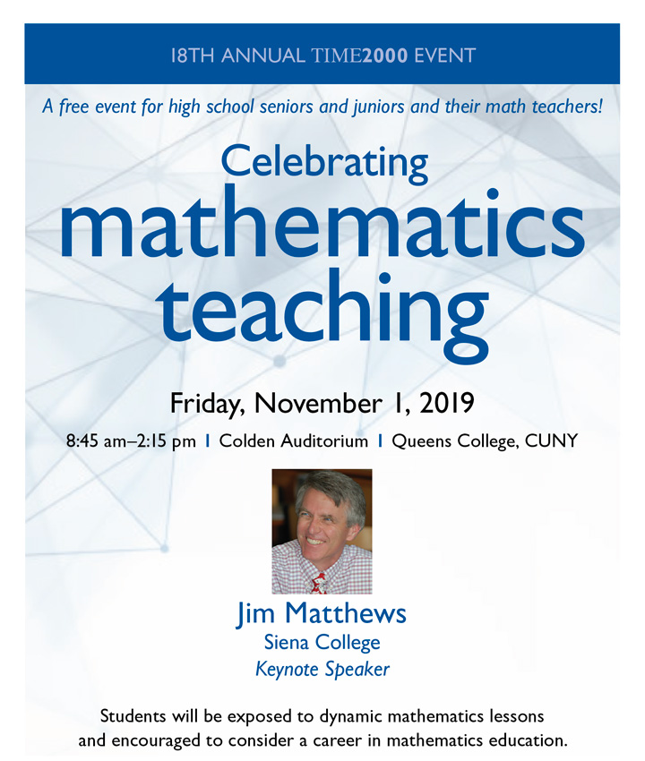 Registration is now open! Dear Mathematics Educators, Happy new school year! TIME 2000 is pleased to announce the annual Celebrating Mathematics Teaching event, a math field day event at no cost to the schools! We hope you can attend with your students on Friday, November 1, 2019. Please note the following guidelines when selecting students. Each student should: * Be a college-bound senior or junior. * Have completed the Algebra 2 course. * Have demonstrated mathematical ability (B average or better) or expressed interest in becoming a mathematics teacher. Additional students/teachers and late registration will be allowed as space permits. Please contact me before registering more than 25 students. I look forward to seeing you in November. Have a great year! Naomi Naomi Weinman TIME2000/SEYS Queens College, CUNY | 65-30 Kissena Blvd | Queens, NY |11367 (w) 718-997-5377 | (f) 718-997-5173 time2000.qc.cuny.edu<https://www.qc.cuny.edu/Academics/Honors/Time2000/Pages/default.aspx> | Donate to TIME 2000<http://bit.ly/time2000> Problems viewing this email? Click here <https://www.qc.cuny.edu/CS/TIME2000/2019/SEYS_TIME2000_Jim_Matthews.html> [https://www.qc.cuny.edu/CS/TIME2000/2019/TIME2000_Jim_Matthews.jpg] [agenda]<https://www.qc.cuny.edu/Academics/Honors/Time2000/Documents/TIME%202000%20Conf%202019%20Agenda%20with%20Felo%20in%20Colden.pdf>[register]<https://www.qc.cuny.edu/Academics/Honors/Time2000/Pages/conferenceapplication.aspx> For further information, please contact Naomi Weinman Naomi.Weinman@qc.cuny.edu <mailto:Naomi.Weinman@qc.cuny.edu> | 718-997-5377 | TIME2000.qc.cuny.edu<https://www.qc.cuny.edu/Academics/Honors/Time2000/Pages/default.aspx> time2000.qc.cuny.edu/conference<https://www.qc.cuny.edu/Academics/Honors/Time2000/Pages/conference.aspx> Registration Deadline: October 15, 2019 [https://www.qc.cuny.edu/CS/TIME2000/2018/footer.png] =