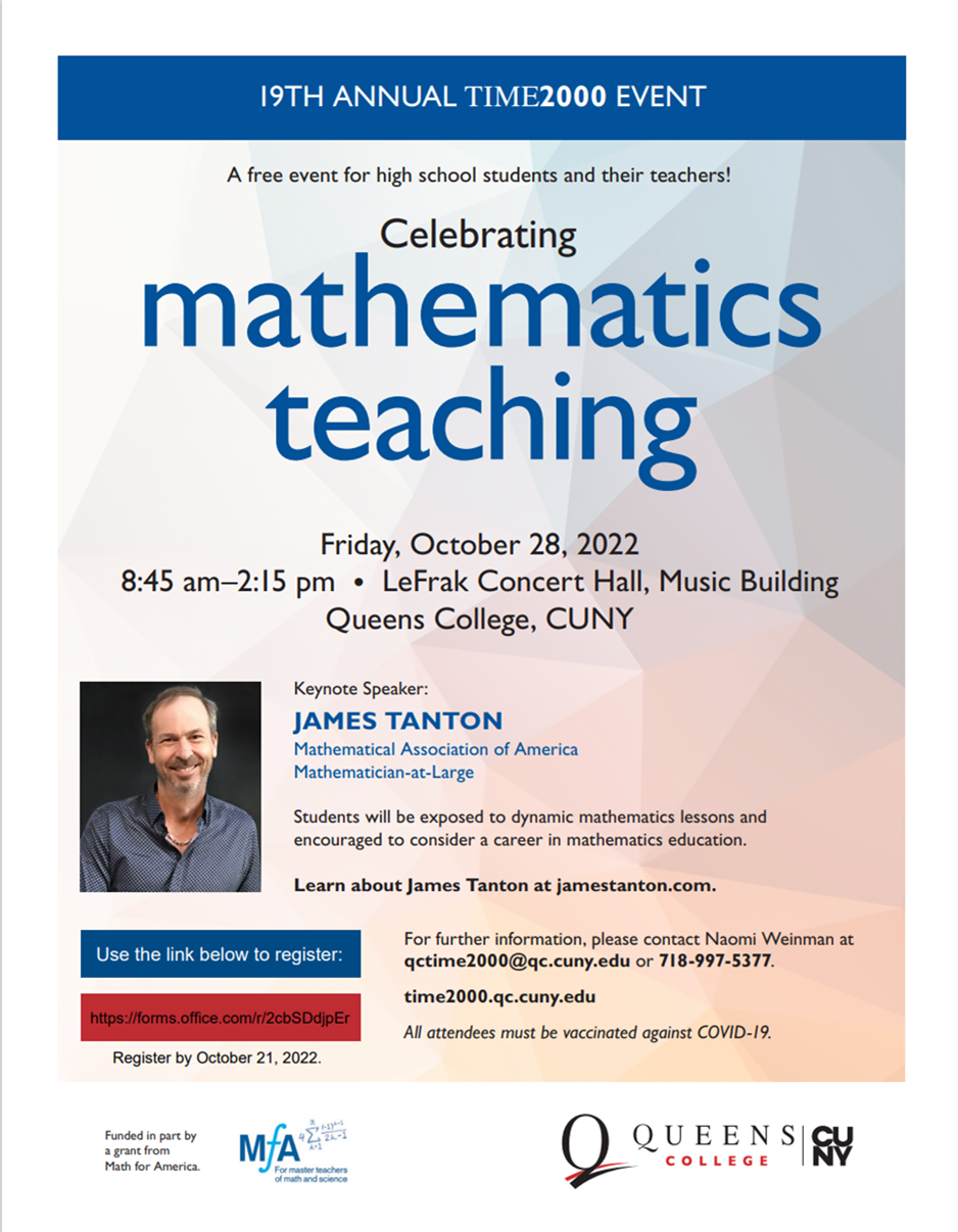 Reminder: Registration is now open for the TIME 2000 event! Please email Naomi.Weinman@qc.cuny.edu<mailto:Naomi.Weinman@qc.cuny.edu> if you have any questions or would like to save seats. Sent: Wednesday, September 7, 2022 4:52 PM To: TIME 2000 Conf Invitn (TIME2000_Conference@lists.qc.cuny.edu<mailto:TIME2000_Conference@lists.qc.cuny.edu>) <TIME2000_Conference@lists.qc.cuny.edu<mailto:TIME2000_Conference@lists.qc.cuny.edu>> Subject: TIME 2000 Conference Event Returns! You're Invited! Please share this announcement with high school administrators and mathematics teachers: Dear Mathematics Educators, I am pleased to announce that, after a two-year hiatus due to the pandemic, the TIME 2000 event for high school students and their teachers, Celebrating Mathematics Teaching, will be held at Queens College on Friday, October 28, 2022. Thanks in part to a grant from Math for America, this mathematics field day event continues to be free of charge to attend! Please note the following guidelines before registration of teachers and students: : * Students should be college-bound seniors or juniors who have demonstrated mathematical ability (B average or better) or expressed interest in becoming a mathematics teacher. * All guests must be vaccinated against COVID-19 to enter campus. * Register online at https://urldefense.proofpoint.com/v2/url?u=https-3A__forms.office.com_r_2cbS... by October 21, 2022. * Notify me of any additions of students, teachers, or chaperones so that all visitors are allowed on campus. * Additional students/teachers and late registration will be allowed as space permits. Please contact me before registering more than 25 students. The invitation and agenda appear below. Please email me if you have any questions. I hope to see you in October. Have a great school year! Naomi Naomi Weinman TIME2000/SEYS Queens College, CUNY | 65-30 Kissena Blvd | Queens, NY |11367 (w) 718-997-5377 | (f) 718-997-5173 TIME2000.qc.cuny.edu<https://www.qc.cuny.edu/academics/ohs/time-2000/> Donate to TIME 2000<https://urldefense.proofpoint.com/v2/url?u=http-3A__bit.ly_time2000&d=DwIFAg... > [cid:image001.png@01D8DD88.A60C3BE0] [cid:image002.png@01D8DD88.A60C3BE0]