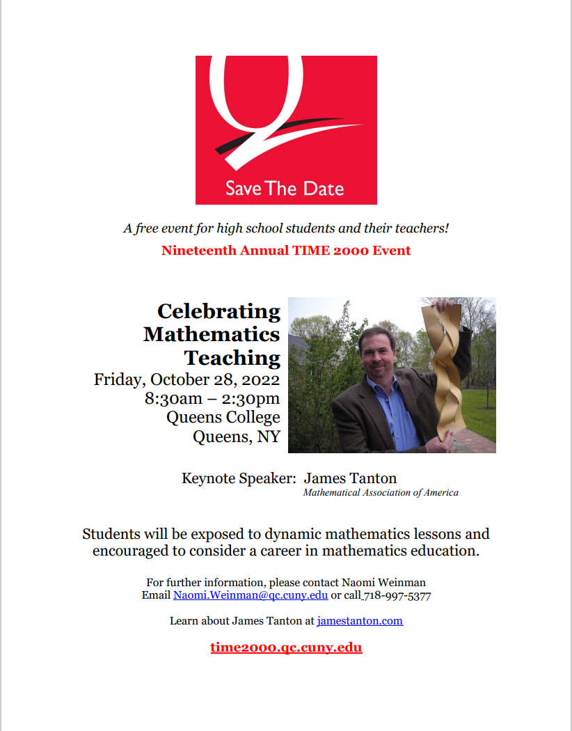 Dear Mathematics Educators, I am happy to announce that, after a two-year hiatus due to the pandemic, the TIME 2000 event for high school students and their teachers, Celebrating Mathematics Teaching, will return this fall. As in the past, there is no registration fee for high school students and math teachers. I hope to see you and your students there! [cid:image001.png@01D8908F.6C33B240] Naomi Weinman TIME2000/SEYS Queens College, CUNY | 65-30 Kissena Blvd | Queens, NY |11367 (w) 718-997-5377 | (f) 718-997-5173 TIME2000.qc.cuny.edu<https://www.qc.cuny.edu/academics/ohs/time-2000/> Donate to TIME 2000<https://urldefense.proofpoint.com/v2/url?u=http-3A__bit.ly_time2000&d=DwIFAg... >