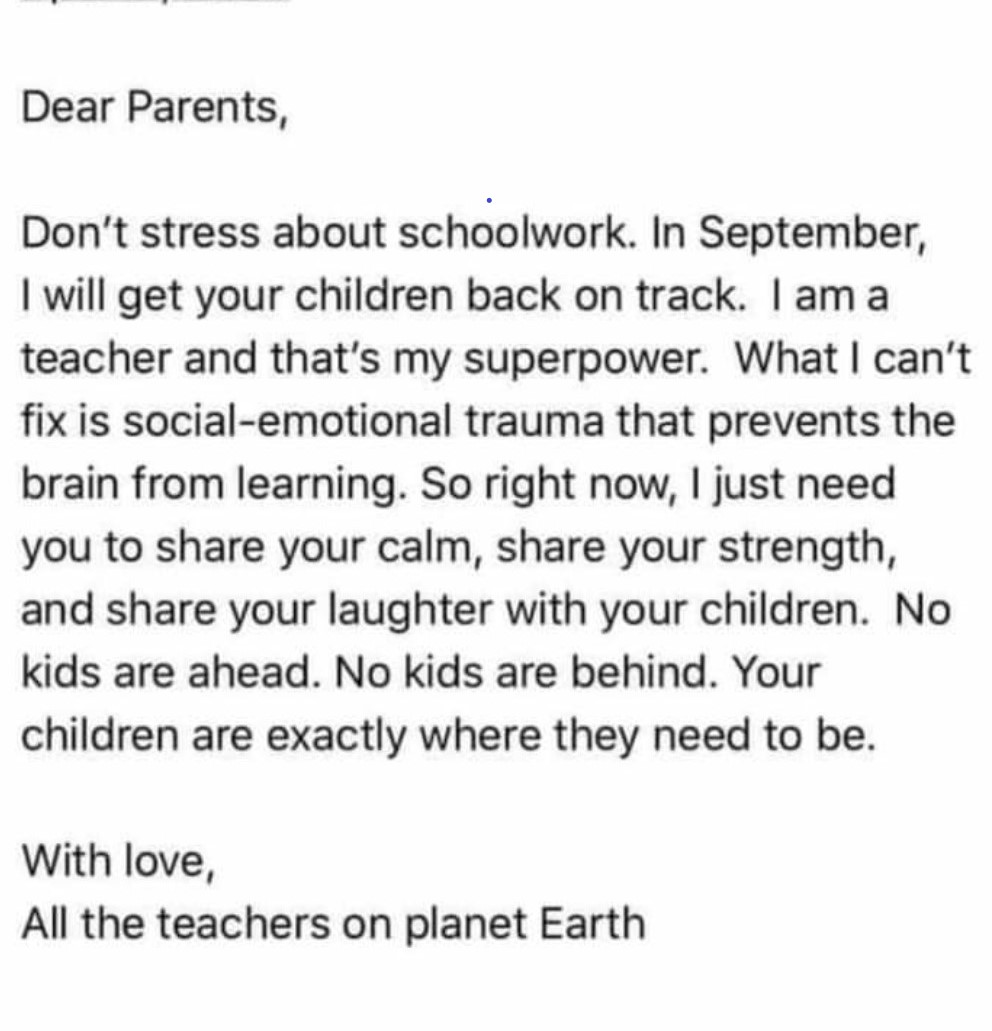 Dear TIME 2000 Students, It is Friday! Dr. Artzt and I think about you every day. Please reach out if you wish to talk to us. I hope you enjoy the attached words from the teachers of the world to the parents. Be well, get well, stay well! Mrs. Weinman Naomi Weinman TIME2000/SEYS Queens College, CUNY | 65-30 Kissena Blvd | Queens, NY |11367 (w) 718-997-5377 | (f) 718-997-5173 time2000.qc.cuny.edu<https://www.qc.cuny.edu/Academics/Honors/Time2000/Pages/default.aspx> | Donate to TIME 2000<http://bit.ly/time2000>