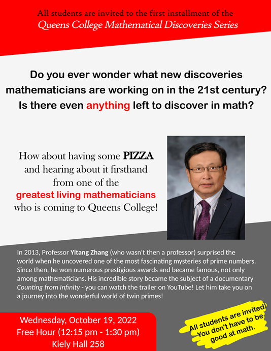 Subject: TIME 2000 Seminar on Tuesday TIME 2000 Seminar Tuesday, October 18, 2022 8:30am-10:05am New Location: President's and Q-Side Lounges, Dining Hall (next to Patio Dining Room)* (same location as the September seminar, Dining Hall 120 and 122) Special Guest: Shari Eng, T-5 Bayside High School Math Teacher & MfA Master Teacher II Presentation: "16 Years of Teaching (so far) and Each One is Always a Learning Experience" Conference questions will be answered at the start of the seminar. Mrs. Weinman will be available after the seminar for more Q&A. Math Dept. Announcement: The talk by mathematician Yitang Zhang will be on Wednesday, October 19 at 12:15pm in Kiely 258. Pizza will be served. This is a very special event we encourage you to attend. [Yitang Zhang.png] *The President's and Q-Side Lounges are part of the Dining Hall/Cafeteria Building. They are at the end of the building closest to Kissena Blvd in the rooms closest to the entrance - before the Patio Room. Food vouchers will be available before the start of the seminar, 8:10am-8:30am. Please note that the cafeteria does not give change if you do not use the entire $6.50 on the voucher. If your meal comes to less than $6.50, consider grabbing a piece of fruit or snack bar for later in the day, or combining your order with a friend's order. Vouchers can be saved and used any time of day during the semester when the food services are open. Seminar attendance is mandatory for all TIME 2000 students. Naomi Weinman TIME2000/SEYS Queens College, CUNY | 65-30 Kissena Blvd | Queens, NY |11367 (w) 718-997-5377 | (f) 718-997-5173 time2000.qc.cuny.edu<https://urldefense.proofpoint.com/v2/url?u=https-3A__nam02.safelinks.protect... > | Donate to TIME 2000<https://urldefense.proofpoint.com/v2/url?u=http-3A__bit.ly_time2000&d=DwMFAg&c=mRWFL96tuqj9V0Jjj4h40ddo0XsmttALwKjAEOCyUjY&r=emixcmlZB7OJeoHjZM_hJ2K6rhZ8pHPBCx0SX6keR20&m=mpfeANU4WgIGfKuiQAyQBm0_TIsZ9Ttf6YLIvpjtgLcZikXkdy4xN9KCWj8m_8uz&s=SwIFf4wDSf4g5Is88szwzuqihcGlLg7giEd41Twq0HI&e=>