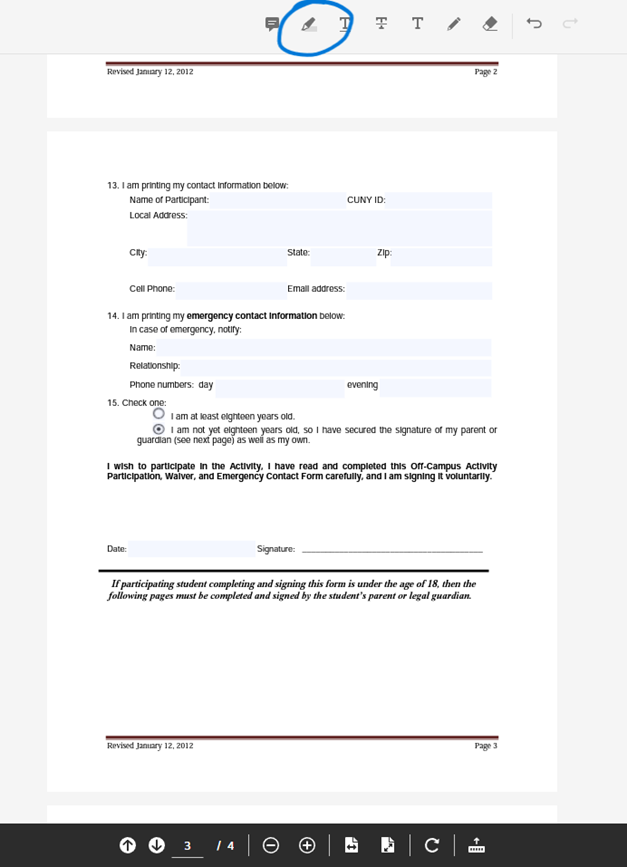 Dear TIME 2000 Students, Happy new year! I hope you are enjoying the winter break. If you are attending LIMAÇON<https://urldefense.proofpoint.com/v2/url?u=https-3A__nam02.safelinks.protection.outlook.com_-3Furl-3Dhttps-253A-252F-252Flimathconference.org-252Fregister-252F-26data-3D05-257C01-257CNaomi.Weinman-2540qc.cuny.edu-257Cfda593d153954fe6323408dac74c8fcc-257C6f60f0b35f064e099715989dba8cc7d8-257C0-257C0-257C638041428887664613-257CUnknown-257CTWFpbGZsb3d8eyJWIjoiMC4wLjAwMDAiLCJQIjoiV2luMzIiLCJBTiI6Ik1haWwiLCJXVCI6Mn0-253D-257C3000-257C-257C-257C-26sdata-3D6JsEme60kaJFvak2giytoNQHZUy-252FDVgY98YhASESMHM-253D-26reserved-3D0&d=DwMFAw&c=mRWFL96tuqj9V0Jjj4h40ddo0XsmttALwKjAEOCyUjY&r=SgarB81jE5b_Lo2s_dByaIHbCPBRoeATsdnSyyK4yhM&m=1L46wy76nWd-ufpVrtyB5BgN5zrua4Hsh7lee0HimSrPB_qHt8p_EJtNJCm0wAMC&s=NurhNiPf4Ix57NM821VLUgh2evlxeXGd38jxJJXBO1c&e=> in March, the college requires that each student complete and submit a Participation, Waiver, and Emergency Contact Form<https://urldefense.proofpoint.com/v2/url?u=https-3A__nam02.safelinks.protect... >. Please read the instructions below and then complete the form. Note that it must be sent to two people, Sadia Ishak in the Provost's office and me. The deadline for submitting the form is February 8, 2023, but early submission would be appreciated. * Complete the form and save it. See instructions below regarding how to sign the form electronically. If you have difficulty with the e-signature, you can print the document, sign it, and then send a scan or photo of the form. You may also email Tobi for help with the e-signature at time2000.officeassistant@gmail.com. * Rename the saved document using the following format with your name and id: First Name Last Name_(CUNY ID #)_Waiver_Course-Section_FA22 For example: Joe Smith_(11111111)_Waiver_208-1A_FA22 · The completed form should be emailed to Sadia.Ishak@qc.cuny.edu<mailto:Sadia.Ishak@qc.cuny.edu> and copied to Naomi.Weinman@qc.cuny.edu<mailto:Naomi.Weinman@qc.cuny.edu> · The subject line of the email should be "TIME 2000 Trip" · The form can be found by clicking on Participation, Waiver, and Emergency Contact Form<https://urldefense.proofpoint.com/v2/url?u=https-3A__nam02.safelinks.protect... > Thank you for your attention to this matter. Sincerely, Mrs. Weinman How to electronically fill out the permission slip- For Microsoft Edge and Firefox Users: 1) Open the contact form link: https://www.cuny.edu/wp-content/uploads/sites/4/page-assets/about/administra... <https://urldefense.proofpoint.com/v2/url?u=https-3A__nam02.safelinks.protect... > 2) In the PDF viewer, fill out your emergency contact information using the fillable text boxes on page 3. 3) Insert your signature on page 3 by using the textbox tool or drawing tool. Microsoft Edge users should look out for these icons if they're unsure where to find them: [cid:image004.png@01D92466.9B9249A0] Firefox users should look out for these icons: [cid:image005.png@01D92466.9B9249A0] 4) Save the form, and email it to TIME 2000. For other browser users: 1) Download the contact form: https://www.cuny.edu/wp-content/uploads/sites/4/page-assets/about/administra... <https://urldefense.proofpoint.com/v2/url?u=https-3A__nam02.safelinks.protect... > 2) Use Adobe's in-browser PDF editor: https://urldefense.proofpoint.com/v2/url?u=https-3A__www.adobe.com_acrobat_o... <https://urldefense.proofpoint.com/v2/url?u=https-3A__nam02.safelinks.protect... >. Create an account. 3) Fill out your emergency contact information using the fillable text boxes on page 3. 4) Insert your signature on page 3 by using the textbox tool or drawing tool. These can be found in the area I circled. Place your signature on the signature line. [cid:image006.png@01D92466.9B9249A0] 5) Download the form using the button in the top-right corner, and email the form to TIME 2000. Remember, let Tobi know if you have any questions. Sincerely, Mrs. Weinman Naomi Weinman TIME2000/SEYS Queens College, CUNY | 65-30 Kissena Blvd | Queens, NY |11367 (w) 718-997-5377 | (f) 718-997-5173 TIME2000.qc.cuny.edu<https://urldefense.proofpoint.com/v2/url?u=https-3A__nam02.safelinks.protect... > Donate to TIME 2000<https://urldefense.proofpoint.com/v2/url?u=http-3A__bit.ly_time2000&d=DwMFAw&c=mRWFL96tuqj9V0Jjj4h40ddo0XsmttALwKjAEOCyUjY&r=emixcmlZB7OJeoHjZM_hJ2K6rhZ8pHPBCx0SX6keR20&m=Dou3vDSsTEuK7UdINMnE4o4vgsMuId82MaMrzU8WI5CGF2Lati9EvTTtKJ7FYH3D&s=TajupwoXfgCaU_8wgTEexqGnOMpHU0w7pcVz8yc3aLE&e=>
