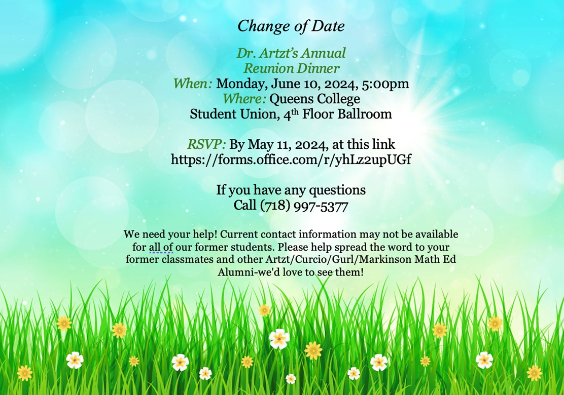 Dear All, It has come to our attention that the original date for the reunion conflicted with a religious holiday. Please note the new date is Monday, June 10, 2024, as per below. Please rsvp by clicking on the link; if you already rsvp'd for the other date, please reply again. Sincerely, Mrs. Weinman Naomi Weinman TIME2000/SEYS Queens College, CUNY | 65-30 Kissena Blvd | Queens, NY |11367 (w) 718-997-5377 | (f) 718-997-5173 TIME2000.qc.cuny.edu<https://www.qc.cuny.edu/academics/seys/time-2000/> Donate to TIME 2000<http://bit.ly/time2000> From: Loriann Maugeri <loriann.maugeri69@login.cuny.edu> Sent: Friday, April 5, 2024 3:19 PM To: Naomi Weinman <Naomi.Weinman@qc.cuny.edu> Subject: New changed date 2024 reunion invitation [cid:image002.png@01DA8777.18411F70]<https://forms.office.com/r/yhLz2upUGf>